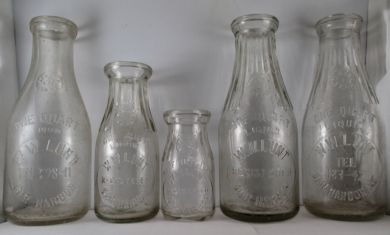 For the milk bottle collectors out there, this collection contains an unusual bottle. (See first photo below.) It has black pyro lettering on one side and embossing on the other (you can see the embossing through the glass in the photo). It is almost like the bottle salesman said to W. W. Lunt "try this new fancy colored lettering out for free on the back of the embossed bottle that you usually order to see how durable it is". There must have been a point when the farmers were wary of something new and the bottle manufacturers were trying to think of ways to get them to try that new technology. I think this bottle is the "missing link" between the older style and the newer, and collectors almost never see it. Notice that the pyro on the bottle is up on the neck/shoulder area away from the sides of the bottle. The neck is safe from wear and tear and rubbing against the metal dividers in the milk cases of that period. The pyro is in great shape and the embossed lettering and the whole lower parts of the bottle have a lot of case wear. I thank my friend and milk bottle collector Frank Shaw for trading this to me. Usually a one of a kind bottle doesn't pass out of a collection.